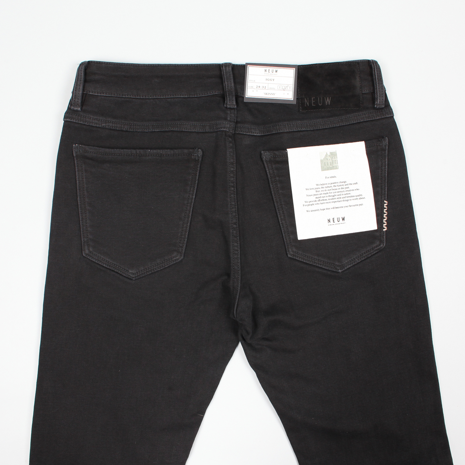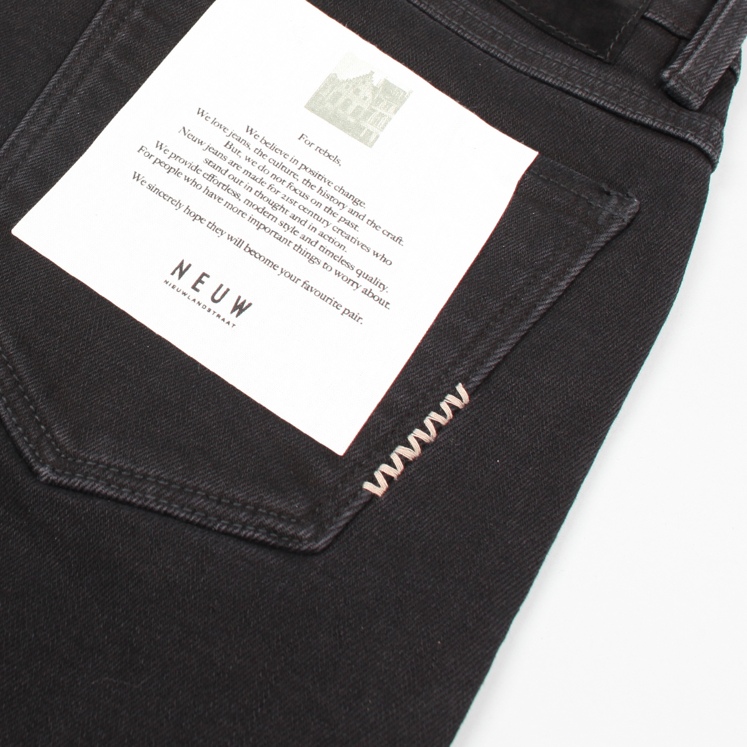 NEUW(新)在比利时布鲁塞尔地区改造创立者Pär Lundqvist复古牛仔雕塑,获得灵感诞生的现代牛仔品牌NEUW,在传统形象的基础上增添复古感,制作高级牛仔. 右腰带吊环和后兜的刺绣缝线,裤脚等象征NEUW诞生历史,为我们最美好的瞬间打造牛仔.
